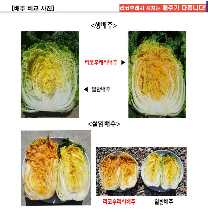 리코후레시 김치는 세계 10대 장수식품 중 하나로 꼽히는 토마토보다도 리코펜(라이코펜) 성분이 10배 이상 많은 리코후레시 배추로 김치를 담급니다. 일반 배추보다 수분함량이 적어 아삭한 맛이 뛰어나며, 식이섬유가 풍부하게 들어 있으며 리코펜(라이코펜) 성분이 배추 잎이 황금색으로 발현되는 유전자 염기서열을 확인한 우수한 기능성 배추입니다.