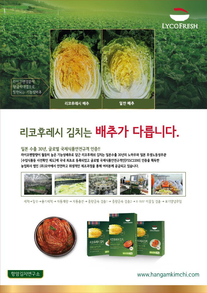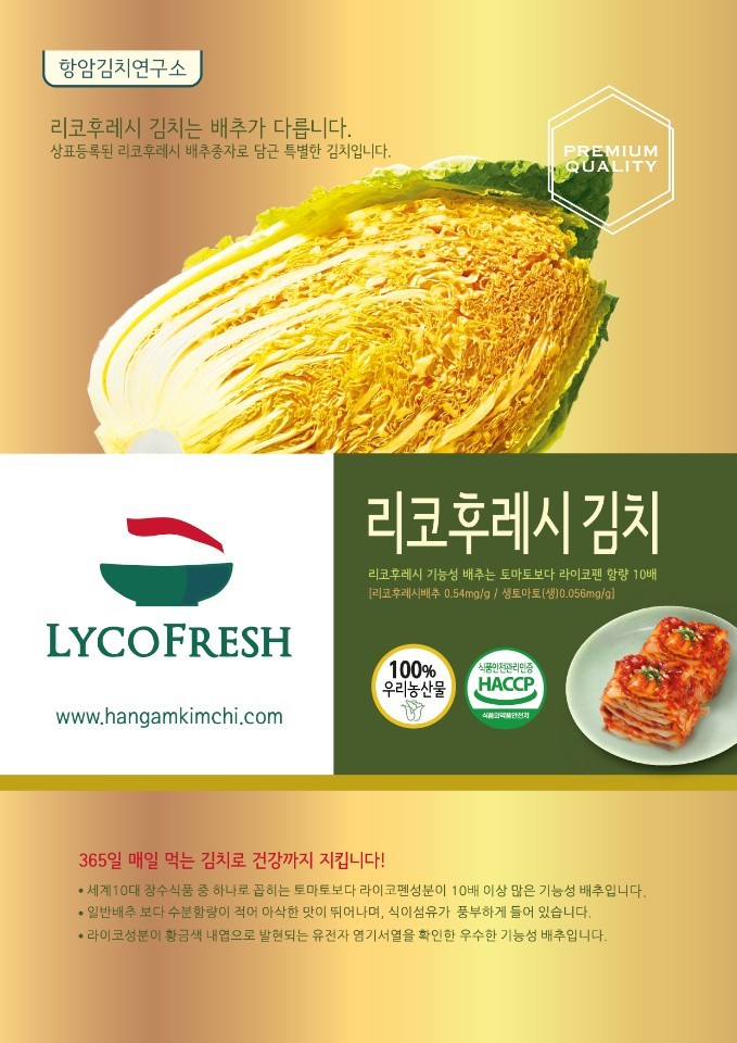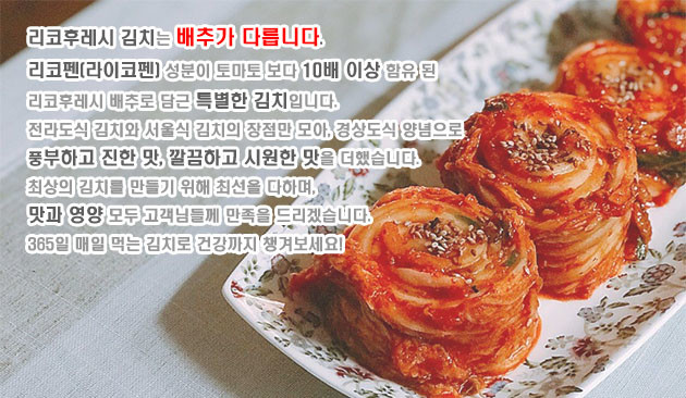 리코후레시 김치는 세계 10대 장수식품 중 하나로 꼽히는 토마토보다도 리코펜(라이코펜) 성분이 10배 이상 많은 리코후레시 배추로 김치를 담급니다. 일반 배추보다 수분함량이 적어 아삭한 맛이 뛰어나며, 식이섬유가 풍부하게 들어 있으며 리코펜(라이코펜) 성분이 배추 잎이 황금색으로 발현되는 유전자 염기서열을 확인한 우수한 기능성 배추입니다.